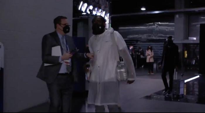 欧文亮相也十分抢镜,穿着一套运动装以及背着双肩包,拄着棍走进球馆,又拿着自己的“打狗棒”来了,篮网双巨真是太另类了。