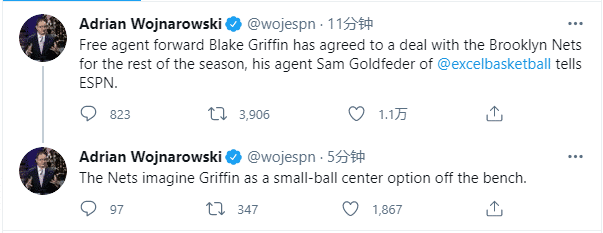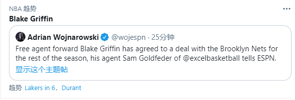 24直播网讯 北京时间3月8日,在NBA亚特兰大全明星赛这一天,格里芬下家终于确定下来,先是shams报道篮网预计签约格里芬,然后ESPN名记报道格里芬已经同意签约篮网,格里芬的经纪人证实了这一重磅新闻,目前只差篮网正式官宣。