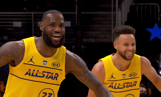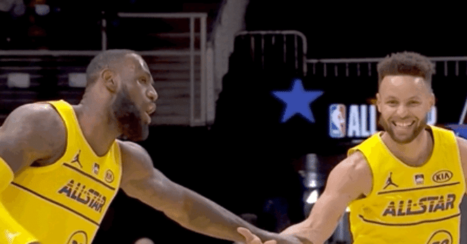 从比赛初期,刚刚拿下三分球大赛的库里和詹姆斯就有意连线,其中库里摘板之后长传球就是找的詹姆斯,可惜詹姆斯没有防守的情况下失误出界了。当库里投进空位三分球之后,两人在回防的时候也是兴奋庆祝。