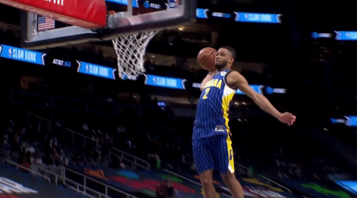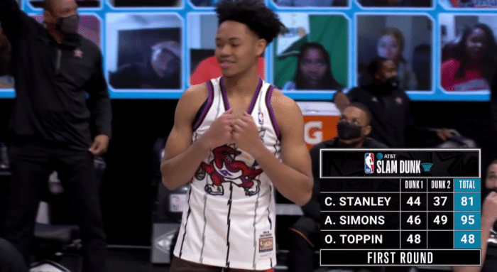第三个出场的是安芬尼-西蒙斯,他的篮筐上还有一个框,起跳后平框,然后扣篮成功,得到46分。