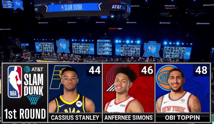 参赛的球员是安芬尼-西蒙斯(开拓者)、奥比-托平(尼克斯)、卡修斯-斯坦利(步行者);扣篮大赛的赛制是预赛依旧是两球,决赛变成一球定胜负。评委均是NBA的扣篮王多米尼克-威尔金斯、小土豆韦伯、杰森-理查德森、迪-布朗和约什-史密斯;