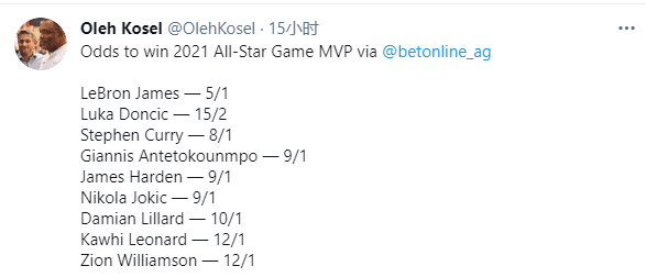 第一名詹姆斯1赔5;第二名东契奇2赔15;第三名库里1赔8;字母哥、哈登和约基奇都是1赔9并排排名;第八名利拉德1赔10;小卡和锡安都是1赔12;从赔率来看,詹姆斯是全明星MVP的最有力争夺者。