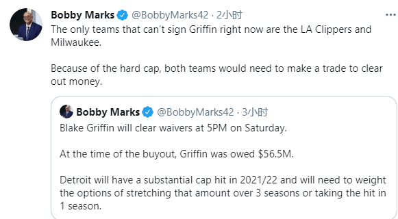 格里芬和活塞达成买断协议后,他还剩下5650万美元的薪水,活塞将在下一赛季创造很大的薪资空间;目前全联盟只有雄鹿和快船因硬工资帽无法引援格里芬,他们需要清理薪资空间才有资格签约格里芬。
