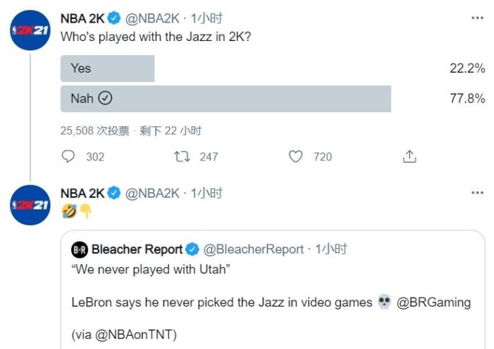 而且巴克利提出质疑,詹姆斯和杜兰特为何到最后才选戈贝尔、米切尔,他们可是联盟第一爵士队的球员啊,詹姆斯解释是就像自己打游戏一样,从来不选爵士,即使斯托克顿和马龙来了也不选。随后NBA2K官方立刻蹭了一波热度,在官推上询问“你会在2K里选择爵士吗?”