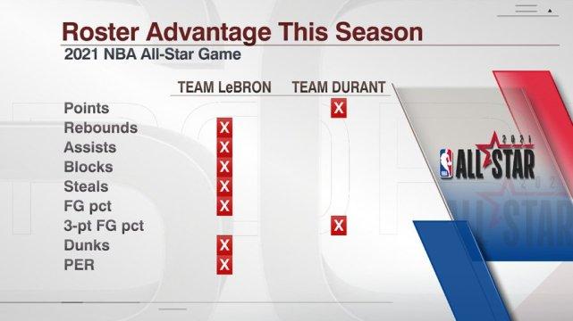 选人结果出炉后,ESPN第一时间从九项基础数据对詹姆斯和杜兰特的选人结果进行综合评估,结果显示,詹姆斯队有七项数据占优。他们占优的数据分别是篮板、助攻、盖帽、抢断、投篮命中率、扣篮和个人效率值,而杜兰特队仅有两项占优,分别是得分和三分命中率。