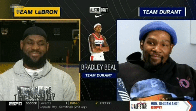 NBA全明星队长选人的现场,镜头刚给到两人,杜兰特的气质就已经完爆老詹了,两人都是身穿了一身运动装,但是显然杜兰特的帽子帮助他加了不少分,有球迷调侃道:这该死的气质,太迷人了。气质这块,杜兰特拿捏得恰到好处。NBA全明星队长选人开始后,詹姆斯是第一选人的,果然shams的爆料十分准确,詹姆斯最先选中了字母哥,两人在2017年的全明星赛上有过一次合作,杜兰特的首选也是没有什么意外,他选择了自己的队友欧文,无论是从那个方面看,杜兰特选择欧文都是最完美的选择,詹姆斯第二位选择的是库里,詹姆斯库里同队打比赛,这也是两人的第一次合作,无论是在NBA赛场上,还是在其他的国家大赛上代表国家队出场,詹姆斯和库里从来没有一块出场打过球,杜兰特的第二选是恩比德。