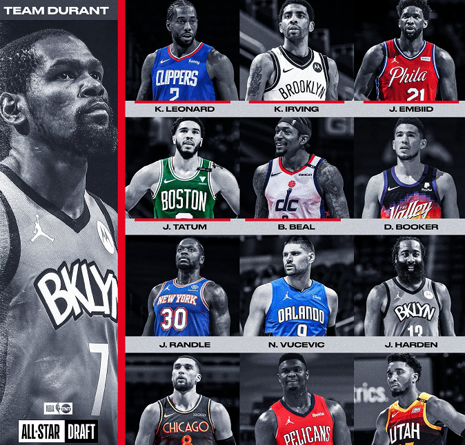 杜兰特队替补:哈登、布克、锡安、拉文、兰德尔、武切维奇、米切尔;