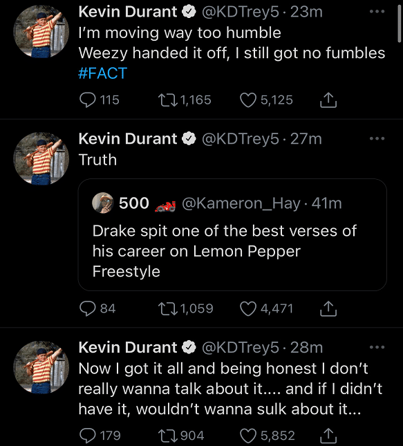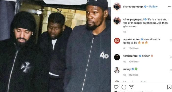 而根据此前的报道,去年杜兰特确诊之前,也是在和Drake一起出去玩。所以现在当Drake出新歌的时候,杜兰特深夜不睡觉也得在线支持,而且疯狂的给Drake的新歌打Call,从这点上可以看出两人之间的关系有多好。
