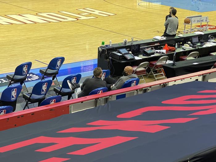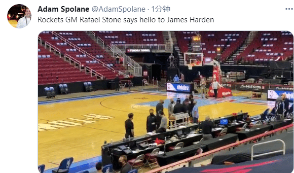 篮网和火箭赛前热身时,哈登主动走到中线附近,和火箭助教卢卡斯打招呼,他们站在一起聊了好几分钟;期间火箭总经理斯通主动走过来,拥抱并且和哈登打招呼;斯通走开后,坐在场边的椅子上和篮网总经理肖恩-马克思闲聊起来。
