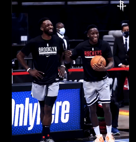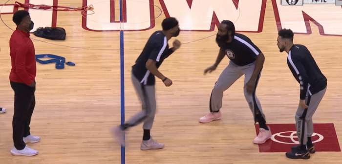 火箭官方晒出哈登、奥拉迪波等球员赛前投篮的画面,期间镜头拍到哈登咧嘴大笑,杰夫-格林和奥拉迪波拥抱,然后两人也是满脸笑容;火箭官推写道:熟悉的面孔回到丰田中心球馆。