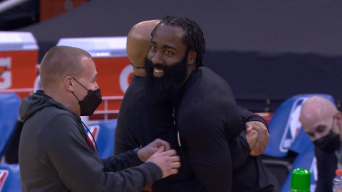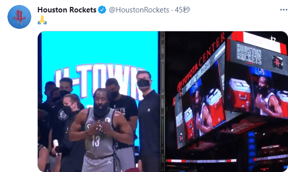 在火箭致敬视频中,纪录了哈登火箭生涯的多个荣耀时刻,比如夺得常规赛MVP,还有哈登为社区做贡献的画面;看到这样的致敬视频,哈登先是伸开双臂,双手做出“爱”的手势,然后双手合十感谢火箭以及现场的球迷;篮网众球员都为哈登鼓掌庆祝。