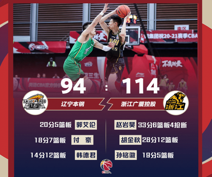 24直播网3月4日讯 今天晚上CBA常规赛焦点战辽篮和广厦的强强对话结束了争夺,最终广厦114-94击败辽篮,这场比赛广厦掌握着主动权,他们首节得到38分,单节领先17分,上半场领先19分,分差也一度拉大到20+,虽然下半场辽篮在郭艾伦的带领下将差距缩小到10分,不过广厦的整体气势和状态更好,他们没有给辽篮翻盘的机会,成功拿下了胜利。胡金秋28分12篮板,孙铭徽19分5篮板5助攻4抢断和赵岩昊33分6篮板4抢断是广厦赢球的最大功臣。郭艾伦(20分5篮板)CBA生涯抢断数来到了645次,超越了辽篮主帅杨鸣(644次),升至CBA历史抢断榜第18位。