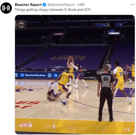 第二节4分多钟,布克追防过程中被达米安-琼斯绊倒,然后布克躺在地板上把波普拉倒,布克这一动作很多余,不过裁判多次回放这一幕,最终并没有给布克恶意犯规,只是普通犯规而已,对此杨毅直言这一球不是恶犯吗?