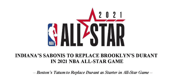 24直播网讯北京时间2月27日,篮网官方宣布,凯文-杜兰特因左腿筋伤势需要更多恢复时间,将缺席本赛季的全明星正赛。随后,NBA官方宣布,步行者球星小萨博尼斯将顶替受伤的杜兰特,入选东部全明星阵容,杜兰特的全明星首发位置,由绿军的塔图姆替代。