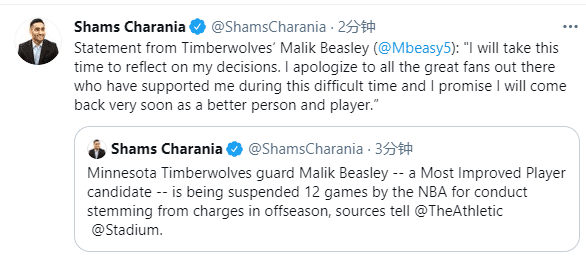 24直播网2月26日讯 北京时间2月26日,NBA正式开出一笔重大罚单,据名记shams报道,森林狼后卫马利克-比斯利因休赛期的指控被联盟禁赛12场比赛,他是本赛季最快进步球员奖的候选人,可因为场外的原因,他已经被联盟禁赛12场,目前比斯利已经发表声明。