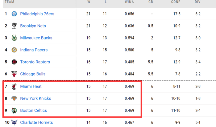 虽然“西强东弱”的格局依然存在,但如今东部竞争也变得非常狂野,绿衫军的确让人失望,三连败后已经跌到东部第十,而热火终于杀回了前八行列!不过第10的凯尔特人与第4的步行者只有1个胜场的差距。很显然,本赛季东部的季后赛争夺会比以往更加激烈,包括排名更靠后的老鹰、魔术、奇才也都有机会。