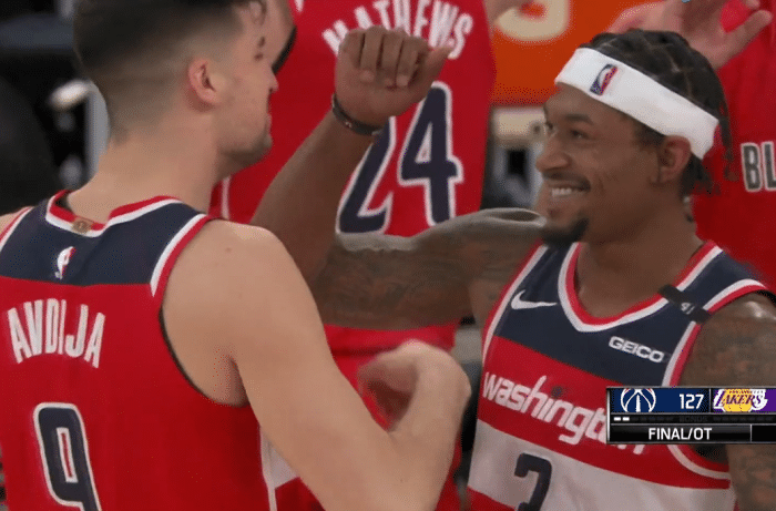24直播网讯 北京时间2月23日,NBA常规赛奇才爆冷127-124击败湖人豪取5连胜,而湖人则遭遇了3连败,输掉了过去5场比赛中的4场,状况堪忧。比尔和韦少成为此役奇才的英雄,比尔轰下33分7板6助,韦少则贡献32分14板9助,两人合砍65+21+15。关键的加时赛,两人也联手率队制胜。