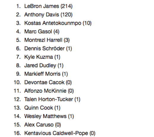 湖人队内具体情况,票王詹姆斯获得了214张球员投票,浓眉哥获得了120张球员投票,最令人意外的要说是字母弟了,他获得了10张选票,在湖人队内仅次于詹姆斯和浓眉哥,确实也有些意外。