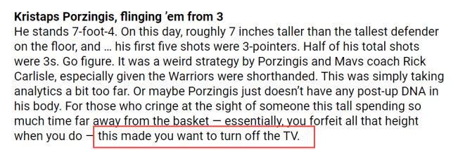24直播网2月05日讯 25分5篮板3助攻2盖帽,投篮16中9,三分8中5。对勇士一战,2米21的独行侠中锋波尔津吉斯在25分钟内拿到上面的数据,乍一看还不错?官网名记Shaun Powell却在看过这场比赛后发文吐槽他的表现,或者说他的打法。
