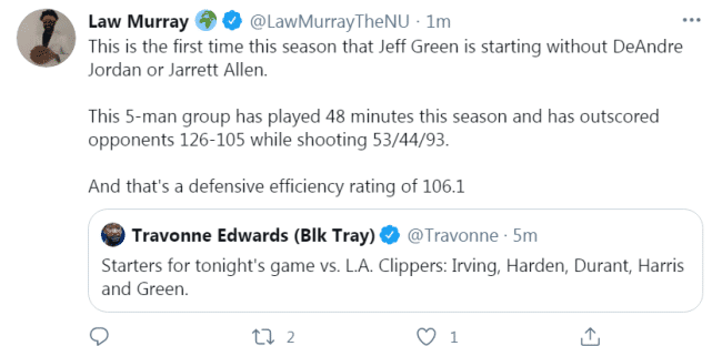 和篮网常规阵容相比,这套阵容的改变在于用杰夫-格林顶替了小乔丹。篮网首发的身高下降了不少,但增强了移动和灵活性。这是格林本赛季第一次没有在小乔丹或者贾内特-阿伦身边首发出场。