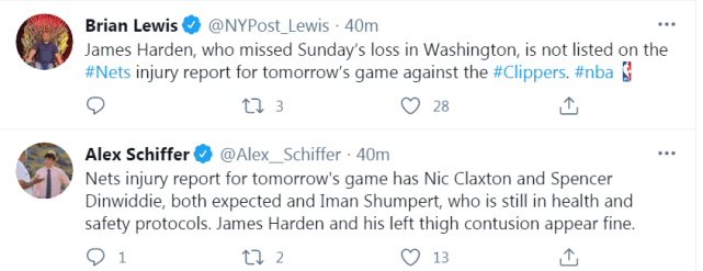这意味着,明天对快船一战,哈登可以出战,篮网三巨头将再次合体出击,迎战西部目前排名第一的快船。