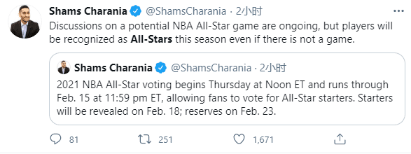 全明星首发名单将在2月19日公布,替补名单将在2月24日公布;即使今年全明星赛取消,入选首发和替补名单的球员都将被授予全明星称号;目前联盟正在商讨在亚特兰特举办一场全明星赛,预计日期是3月7日,工会主席保罗支持这样的做法。