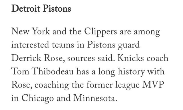 消息源透露,底特律活塞的后卫德里克-罗斯引起多支球队兴趣,尼克斯和快船在其中。尼克斯教练汤姆-锡伯杜曾在公牛森林狼执教过这位昔日的MVP,两人有过很长的合作经历。赛季至今,罗斯场均14.8分2.2篮板4.6助攻。快船一直在寻求控卫位置的补强,此前,也有记者报道称快船对鹈鹕的球哥也有兴趣。