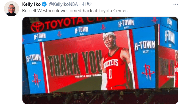 火箭在丰田中心球馆播放一段致敬韦少的视频,欢迎韦少重返丰田中心,播放韦少为休城社区做贡献的画面,视频以韦少身穿火箭0号战袍结尾,上面写着:谢谢你,拉塞尔-韦斯特布鲁克!
