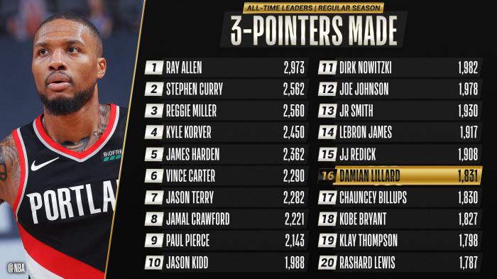 24直播网1月25日讯 开拓者击败尼克斯,9胜6负排名西部第四,利拉德打出疯狂一战,全场17投11中轰下39分8助攻5篮板,其中三分球10中6、罚球11中11;利拉德带队赢球的同时破纪录,生涯常规赛三分命中数达到1834记,正式超越名宿(1830记三分)比卢普斯升到历史三分榜第16名。