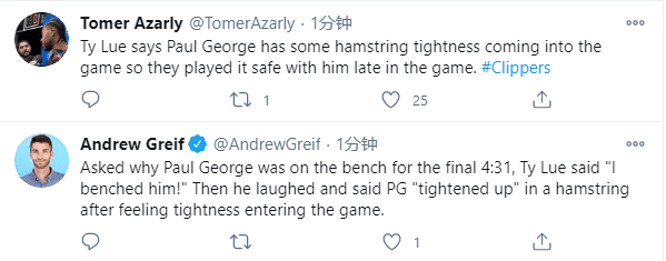 为何关键4分30秒快船弃用乔治?赛后快船主帅泰伦卢说出真正原因,卢指导表示:我让他坐替补席的...不,我只是和你们开玩笑,他在比赛中腿筋有点紧张。在最后4分钟里,他又感到腿筋紧张起来。我们只是出于谨慎考虑才不让他上场的。