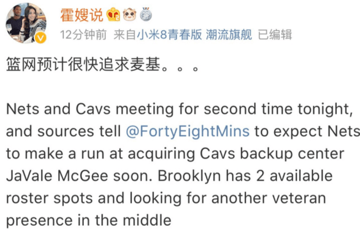 据FortyEightMinutes记者Sam Amico报道,数位消息人士透露,篮网正在追求骑士中锋贾维尔-麦基。他们爆料麦基打篮网这两场都没上就是在考虑报价的问题,拥有7尺身高的麦基很适合篮网,本赛季状态也十分出色,场均16.9分钟能砍下8分6.2板1.1封盖,效率非常好!