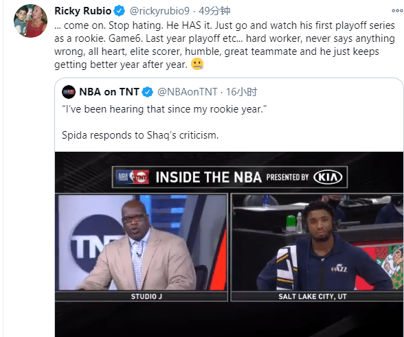 不久前米切尔前队友卢比奥发推声援米切尔,写道:得了吧!停止仇恨!他一直都在进步,去看他作为新秀的第一场季后赛吧,去年季后赛等等...努力工作,从不说错话,全心投入,优秀得分手,谦虚,伟大的队友,他只是一年比一年好!