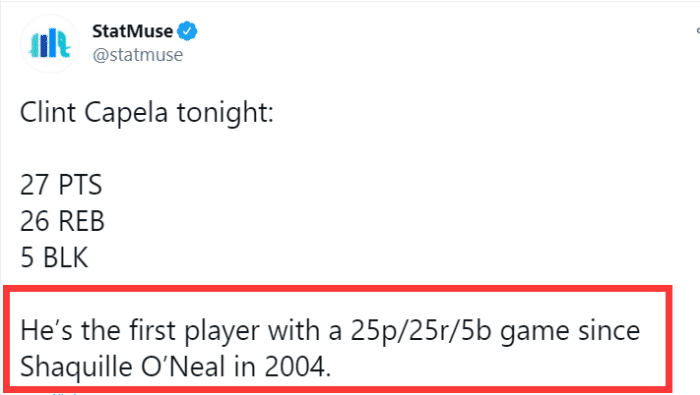 26个篮板创造个人生涯新高,据美媒statmuse统计,卡佩拉此战成为NBA现役第一个打出单场至少25+25+5帽的球员!NBA上一位打出这种数据的球员是史上最具统治力的中锋奥尼尔,大鲨鱼在04年对阵雄鹿的一场比赛砍下了31分27板7帽的逆天数据!