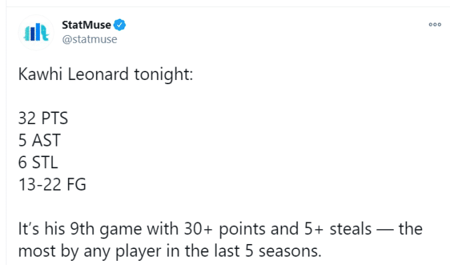 快船官微也特意P出了一张照片(下图),来称赞莱昂纳德的死亡缠绕。事实上,这不是莱昂纳德生涯第一次拿到30+6抢断的数据,16-17赛季在马刺以及18-19赛季在猛龙,莱昂纳德分别拿下过34分6断和31分6断的表现。这也是莱昂纳德生涯第5次单场抢断次数在6次或以上。他的生涯单场抢断之最是7次,出现在14-15赛季对阵勇士的比赛中。