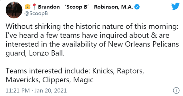 24直播网讯 北京时间1月21日,据NBA记者布兰登-罗宾逊报道,新奥尔良鹈鹕的控卫朗佐-波尔(球哥)引起了不少球队的兴趣,尼克斯猛龙独行侠快船魔术都已联系鹈鹕,询价球哥,探讨交易他的可能。