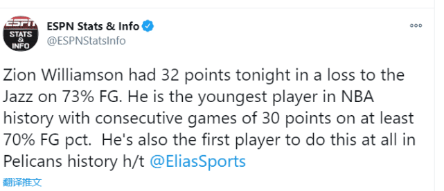本场比赛,锡安19中14拿下32分,创下了多项纪录。第一,他成为NBA历史上以70%命中率以上连场轰下30+最年轻的球员。第二,他也是鹈鹕队史一位做到这一点的球员。在上一场比赛中,锡安15中13得到了31分。