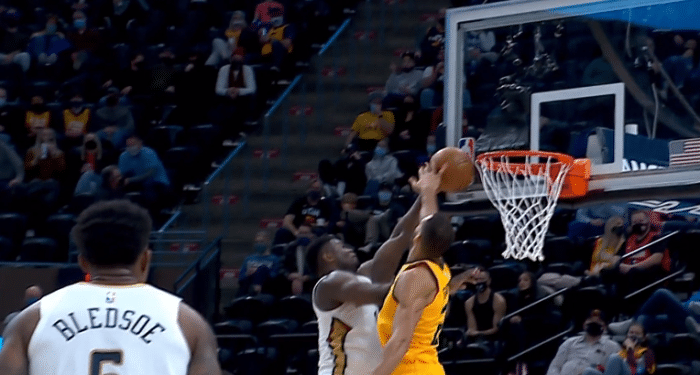 首节比赛,锡安5投5中贡献10分统治禁区,虽然杀到禁区不敢挑战戈贝尔,但到了第二节,锡安又一次冲起来,迎着戈贝尔的长臂把球打进,顶着DPOY戈贝尔的防守上篮太豪横;半场结束前2分多钟,锡安突破撞倒博格达诺维奇,可上篮时惨遭戈贝尔大帽,前有阻拦后有补防,锡安又遭遇巨星级别的防守。
