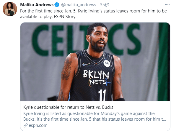 24直播网1月18日讯 篮网三巨头正式首秀就要来了吗?篮网队已经更新欧文的出战状态,欧文被列为出战成疑(50%可能性),相比于之前篮网连续六场把欧文列为缺席比赛,欧文有可能在下一场篮网和雄鹿比赛中复出,这已经是一大突破性进展。