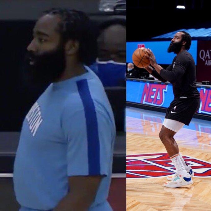 美媒对比哈登几天前身穿火箭球衣和现在哈登身穿篮网紧身衣的画面,身材发生很大的变化,鼓起的大肚腩彻底消失不见,精壮的哈登又回来了。