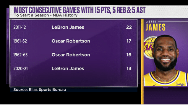 赛季开打至今,詹姆斯已经连续13场只至少15分5篮板5助攻排名开局场次历史第四位,此项纪录历史第一是詹姆斯在11-12赛季创造的——开局连续22场15+5+5,本赛季詹姆斯有望打破自己保持10年的历史纪录。