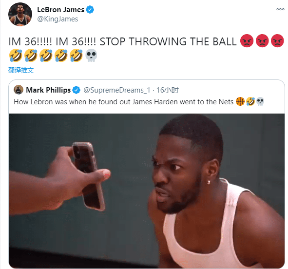 24直播网1月15日讯 此前詹姆斯表示对火箭把哈登交易到篮网没有太大反应,不过看到有人恶搞自己对哈登的夸张反应,詹姆斯转发视频并正式回应:我36岁了!我36岁了!别再扔球了!还配上:3个发怒生气和5个哭笑不得表情。