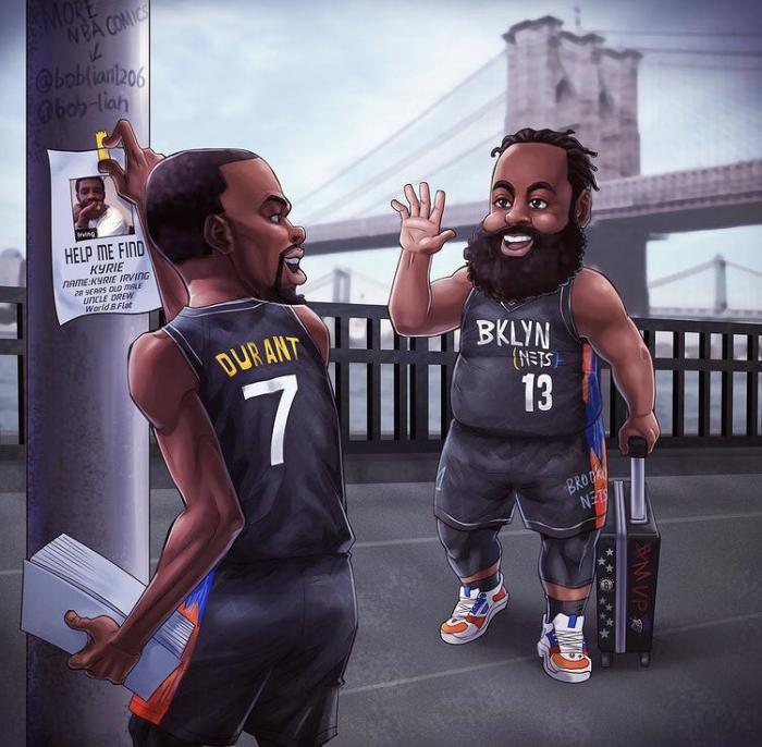哈登将在今天抵达纽约,一旦通过检测便能身披篮网13号战袍出战,对此美媒晒漫画十分形象——哈登身穿篮网13号球衣,提着行李箱抵达布鲁克林,向杜兰特打招呼,此时杜兰特正在张贴“寻找欧文的告示”,希望借助大众的力量赶紧找到欧文。