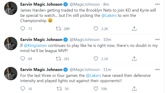 约翰逊还提到了哈登的交易。“詹姆斯-哈登被交易到篮网,和KD、凯里的组合会很特别,但我仍然看好湖人赢得总冠军。”