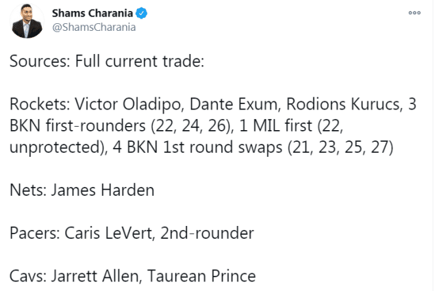 24直播网讯 北京时间1月14日,一笔关于哈登的四队大交易正式达成!篮网得到哈登,火箭得到奥拉迪波、埃克萨姆、库鲁茨、4个首轮和4次选秀互换权,步行者得到勒维尔和一个次轮签,骑士得到贾内特-阿伦和普林斯。