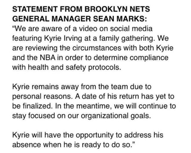 篮网总经理肖恩-马克斯也就此事发表了声明。他写道:“我们注意到社媒上有一段欧文参加家庭聚会的视频。我们正与欧文本人以及NBA官方一起审查相关情况,以确认其行为是否符合联盟健康和安全协议。目前欧文由于个人原因仍暂未归队,他的回归时间也还没有最终确定。在这个时刻,我们依然会专注于球队的目标。当欧文准备好时,他将有机会来解释缺席的原因。”