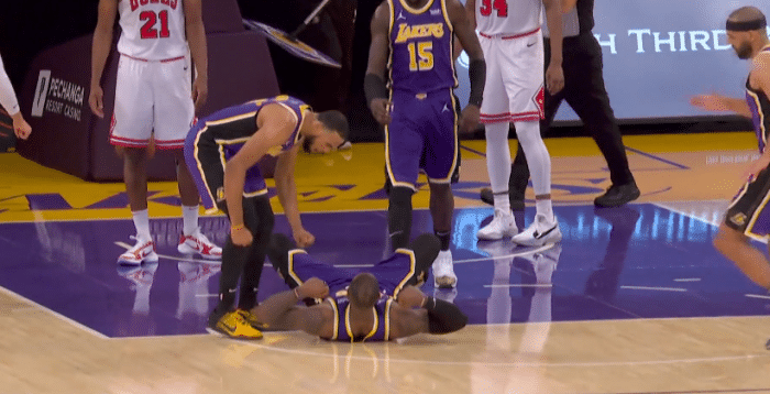 24直播网1月9日讯 北京时间1月9日,湖人主场背靠背击败公牛,浓眉和波普都因伤缺席比赛,其中波普因脚踝伤势已经连续缺席四场比赛;湖人变阵,库兹马重回替补,马修斯和大莫里斯首发出战,詹姆斯轰下28分7篮板7助攻,急刹车慢三步和摔倒躺射2+1太疯狂,可惜外线5投0中。