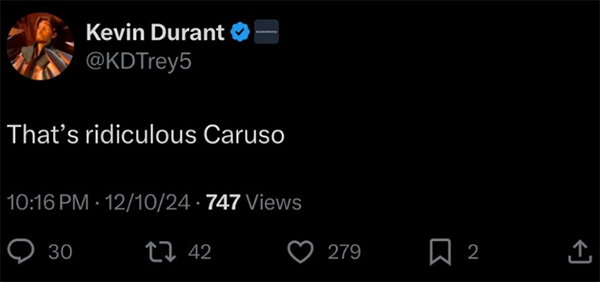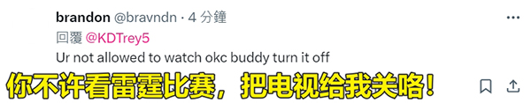 杜兰特发推盛赞卡鲁索,这并没有什么值得争议的事情,可随后杜兰特秒删推文,如此举动引热议,有球迷表示:你不许看雷霆比赛,把电视给我关上;还有球迷表示:KD回来吧,你知道你想要成为(雷霆队)的一份子。
