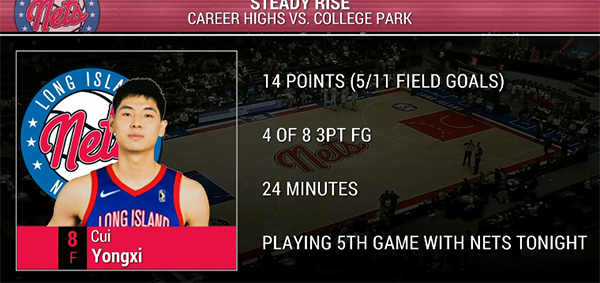 上一场为长岛篮网替补出战24分钟,崔永熙砍下14分4篮板2助攻3抢断2盖帽。此役,崔永熙出场时间、出手数、进球数和盖帽等多项数据均刷新了个人G联赛纪录。