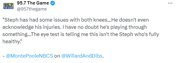 为何库里状态严重失常,据勇士随队记者Monte Poole报道,库里的两个膝盖都有些问题,他甚至不承认自己的伤势,我毫不怀疑他正在带伤上场,我们可以观察到,这不是完全健康的库里。