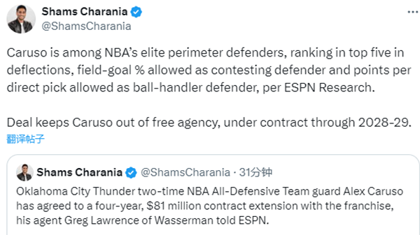 据名记Shams报道,卡鲁索的经纪人透露,卡鲁索已经同意和雷霆达成4年8100万美元的续约合同,这是卡鲁索在雷霆能拿到的最大续约合同;这笔续约使得卡鲁索无法在明夏成为自由球员,他的合同将持续到2028-29赛季。